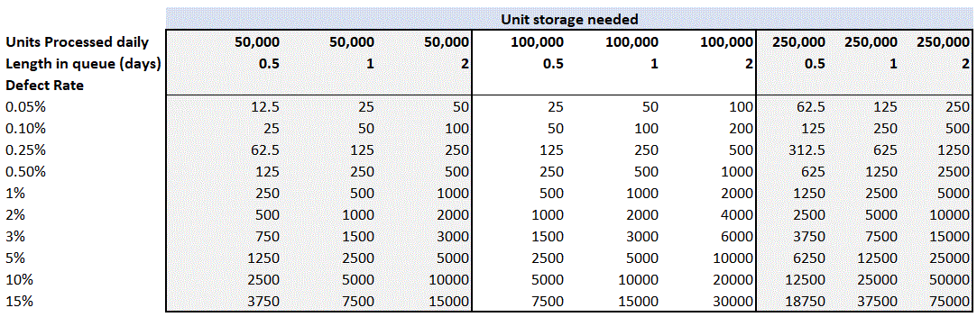 Wow! A facility processing 250,000 units daily with 1% defects (or a 99% first-pass yield) and problem-solving everything within a day still has to accommodate 2500 units of problem-solving. If the resolution time goes down or defect rates go up, so does the storage requirement.